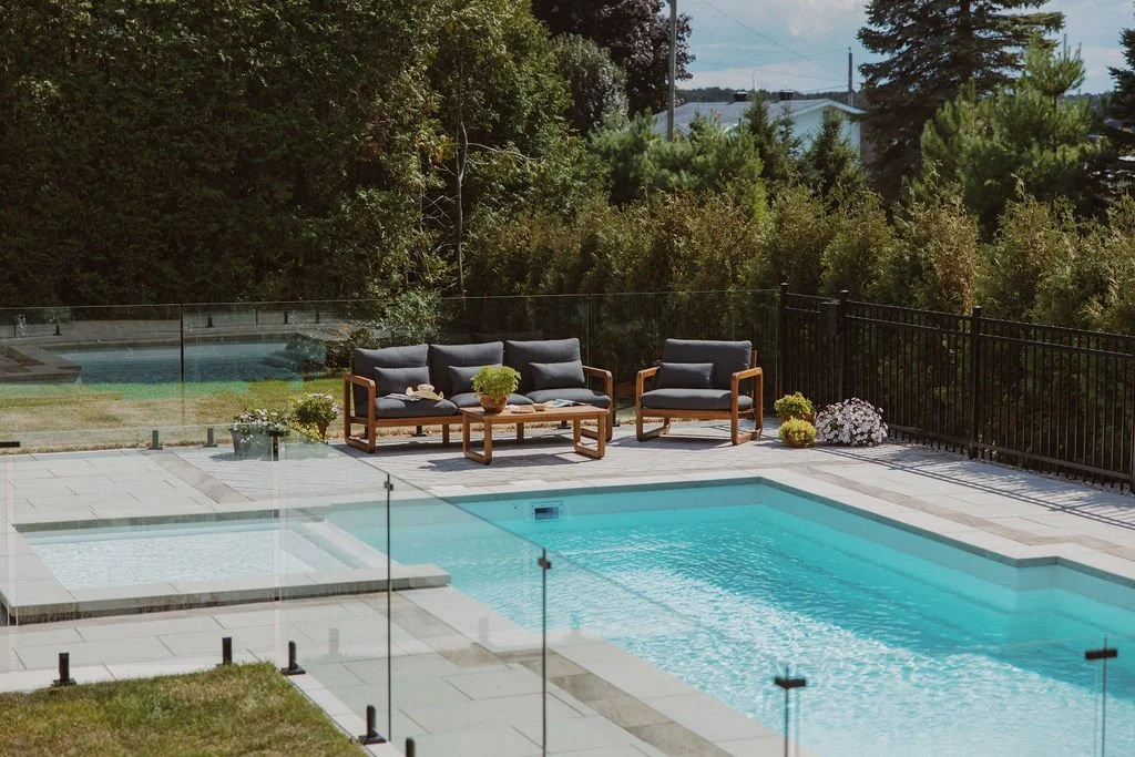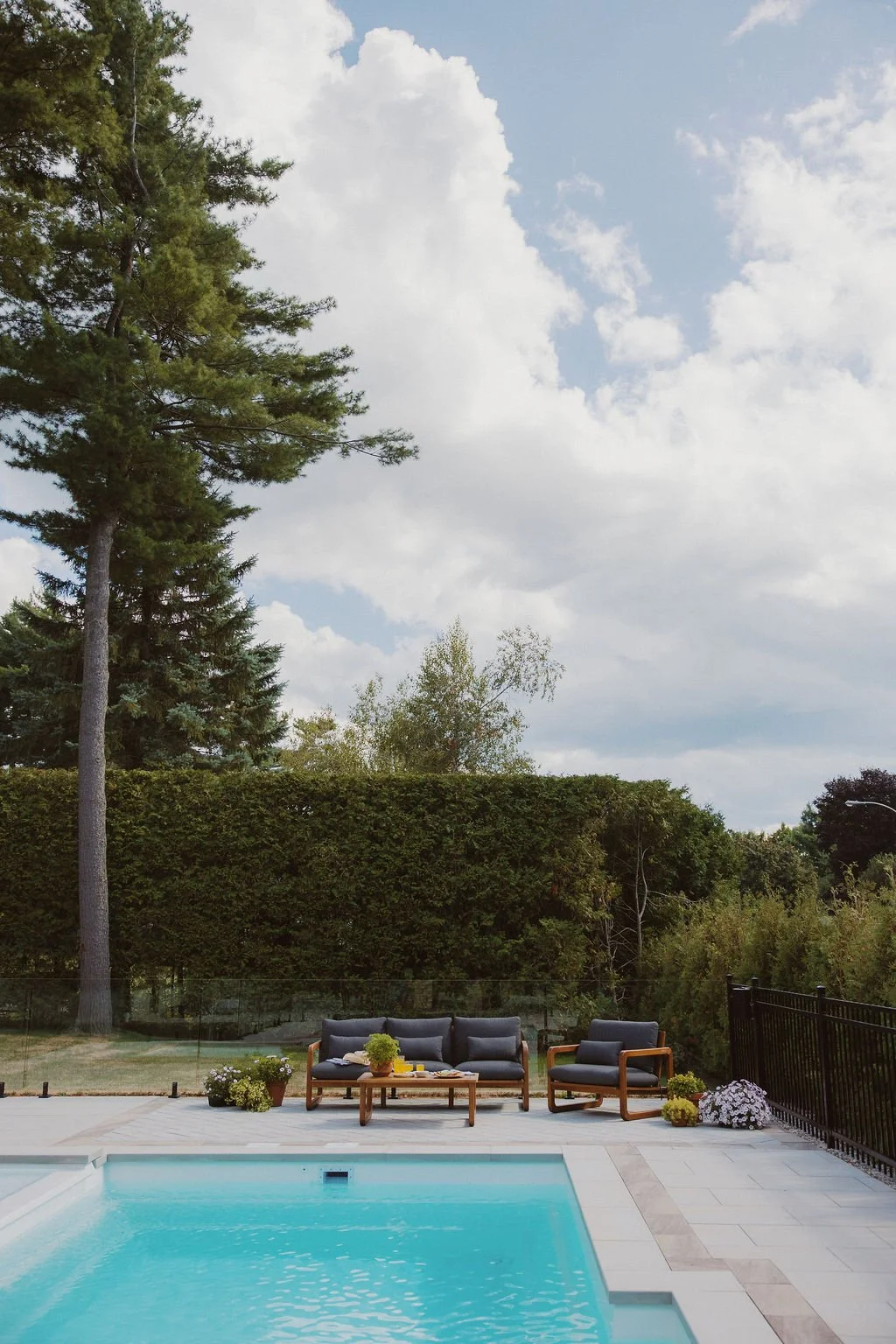 A fibreglass pool with a shallow beach area. A covered outdoor kitchen with a built-in BBQ, a griddle, a sink, a fridge, and a bar with seating. A dining table that seats the whole family and then some. In Ormstown, on a quiet property with a lot of sky - this is what we built.