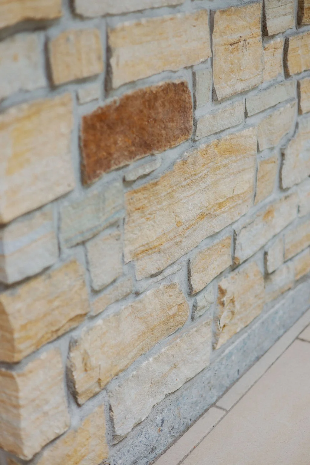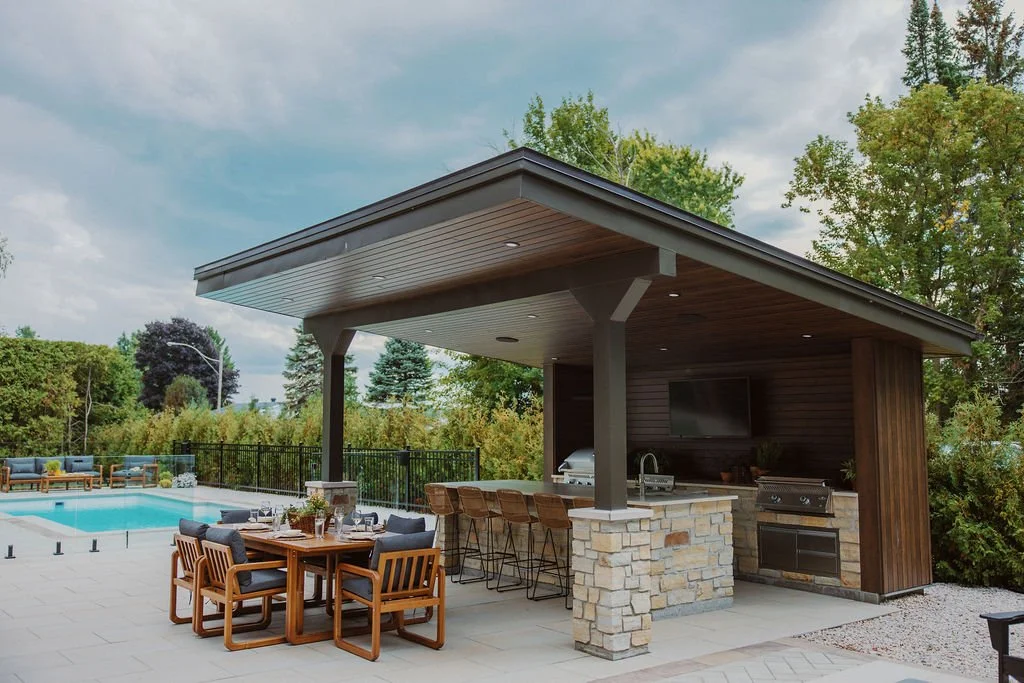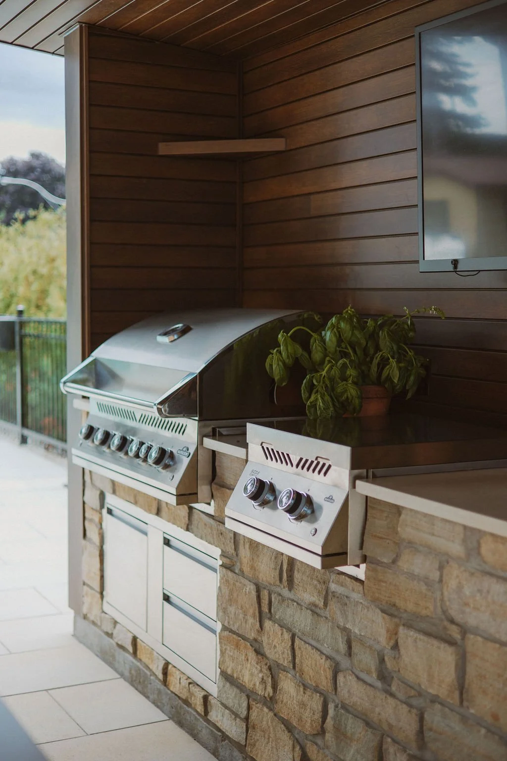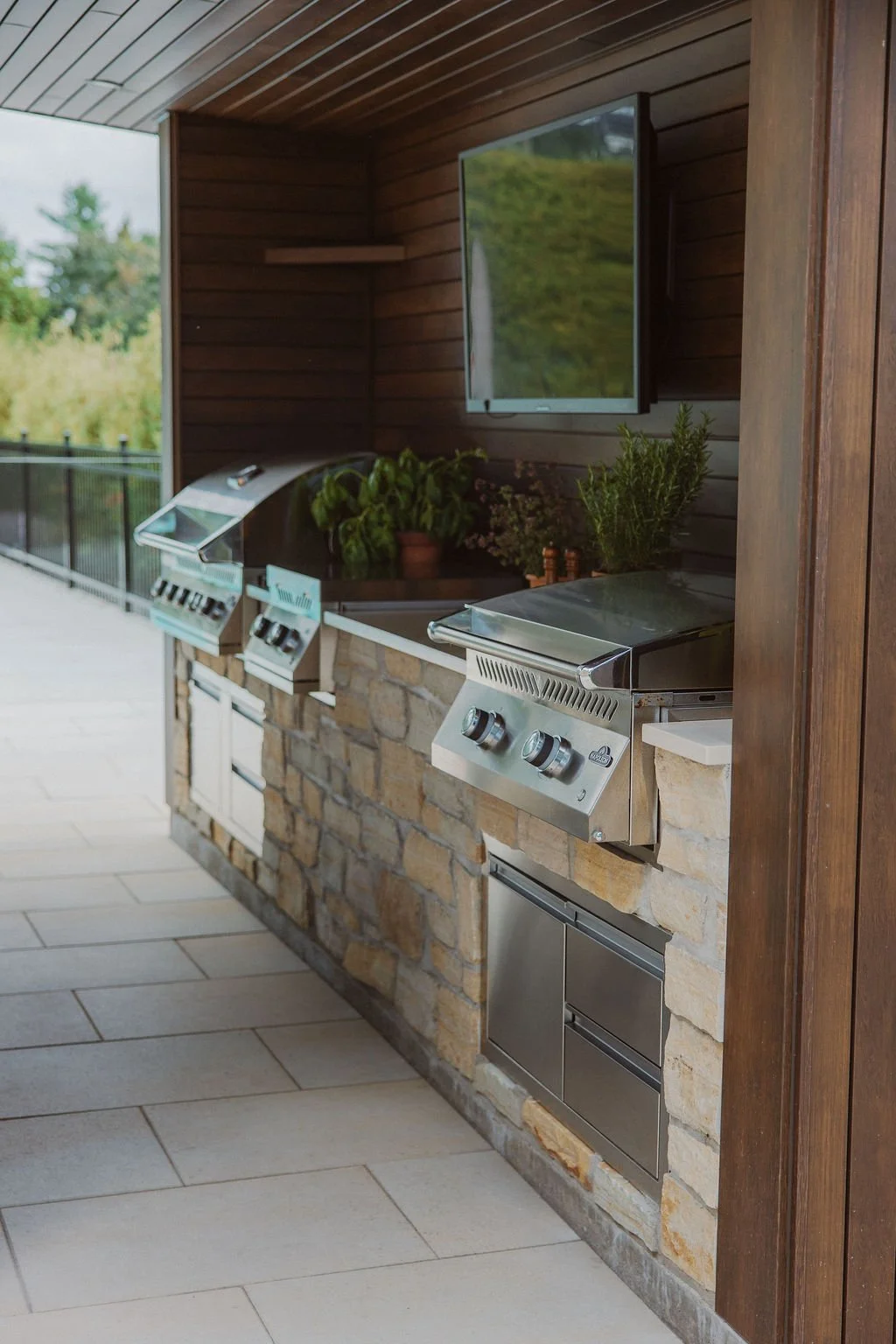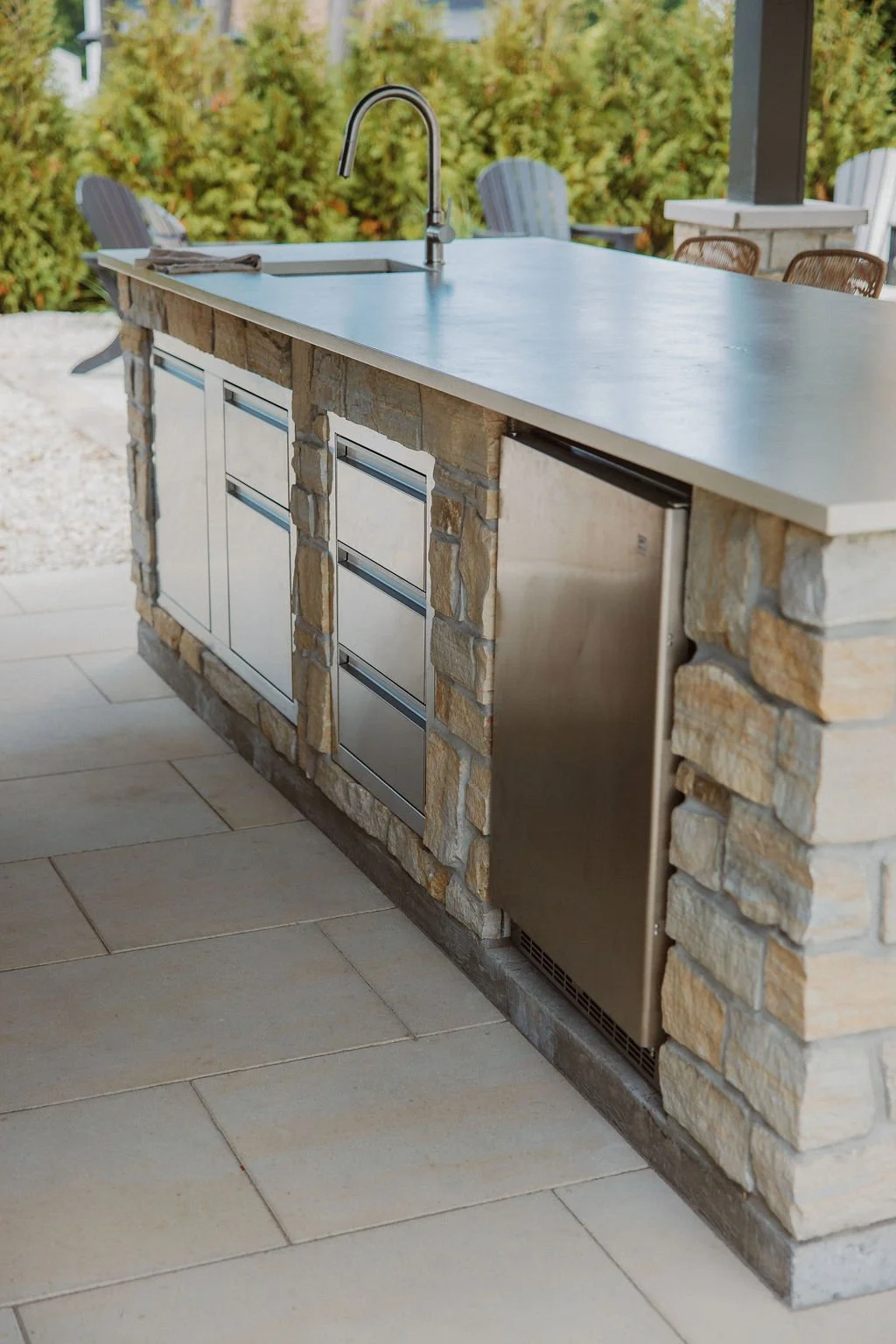 The kitchen base and island are built from natural stone sourced locally in Franklin, Quebec. It has warmth and texture that feels right in a backyard setting - nothing too polished, nothing that looks like it was dropped in from somewhere else.