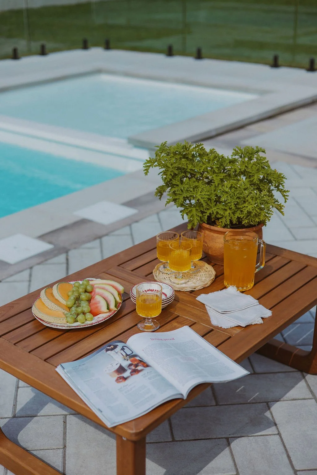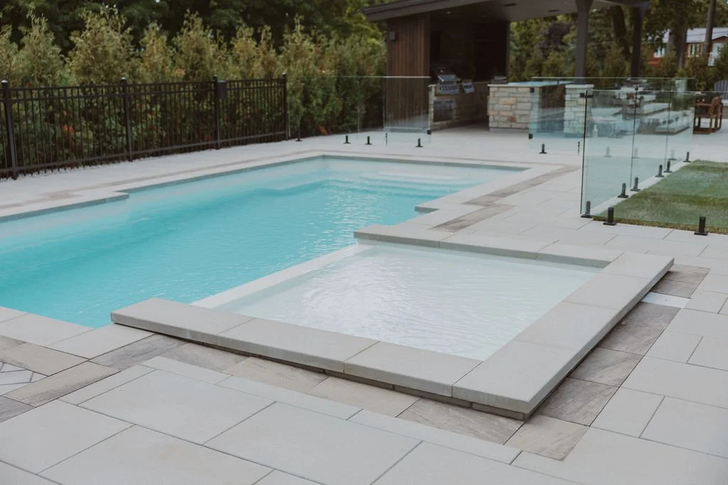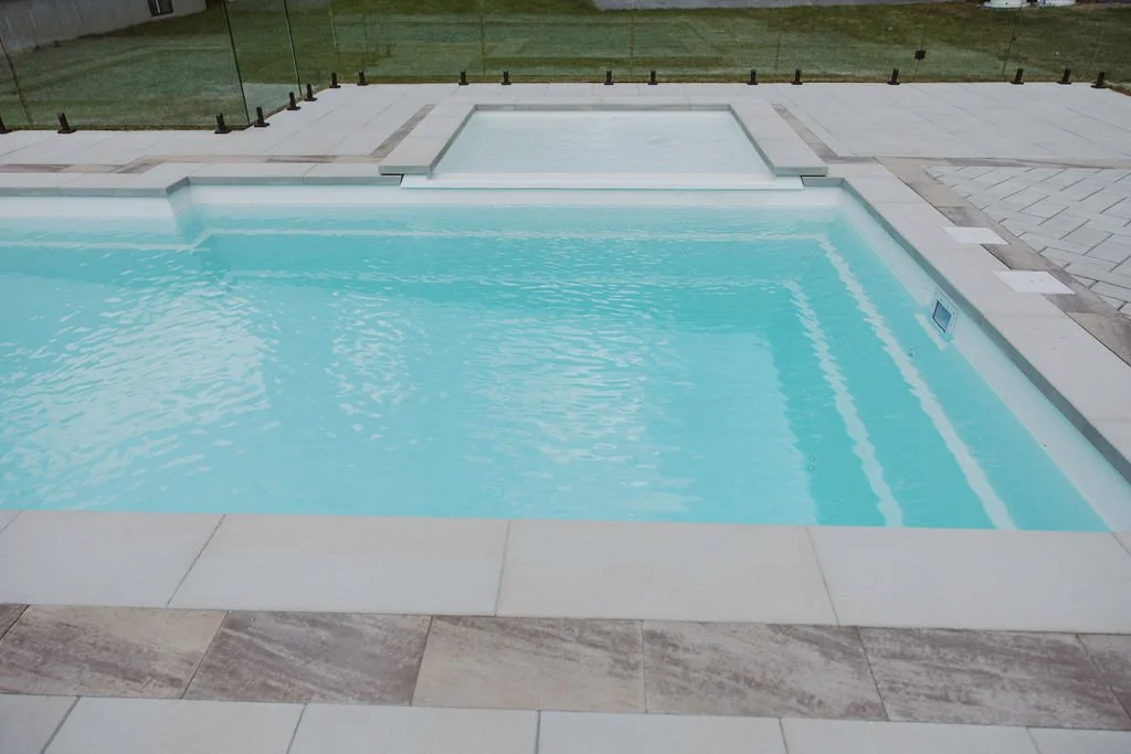 The pool is a simple fiberglass rectangle. On one end there's a shallow beach area - a gradual slope where the water stays low. It's one of those details that changes how a pool feels. More relaxed. More like somewhere you settle into for the afternoon.