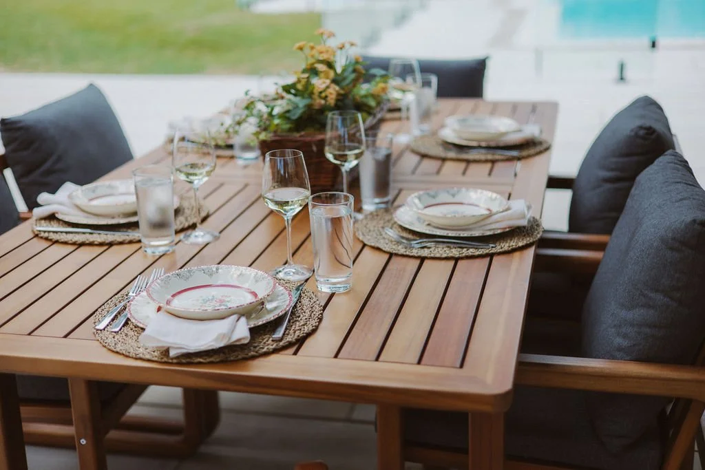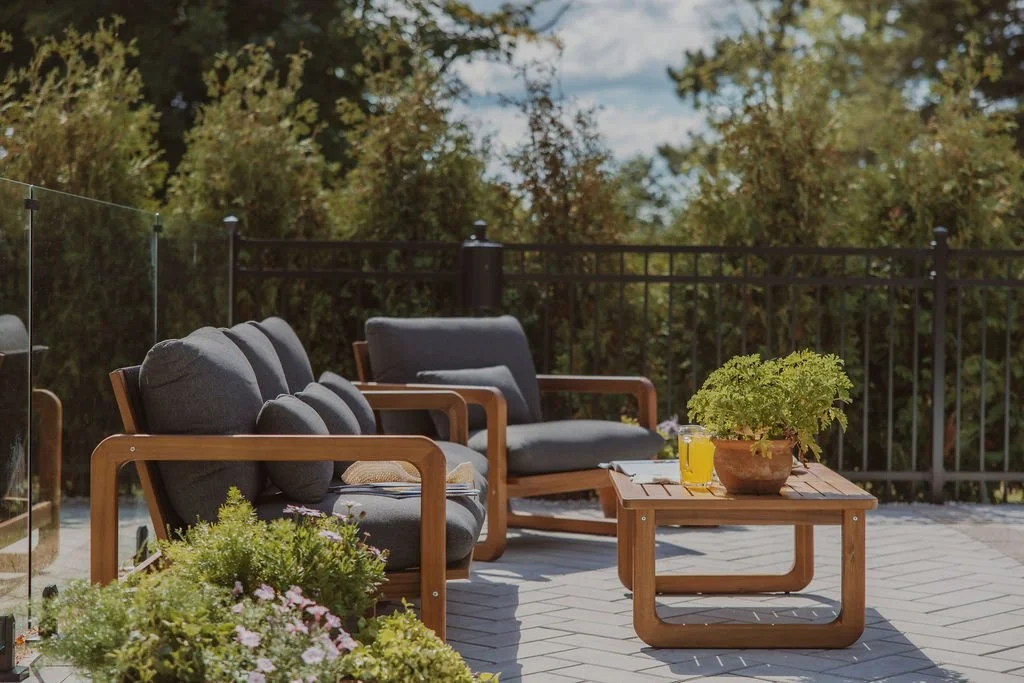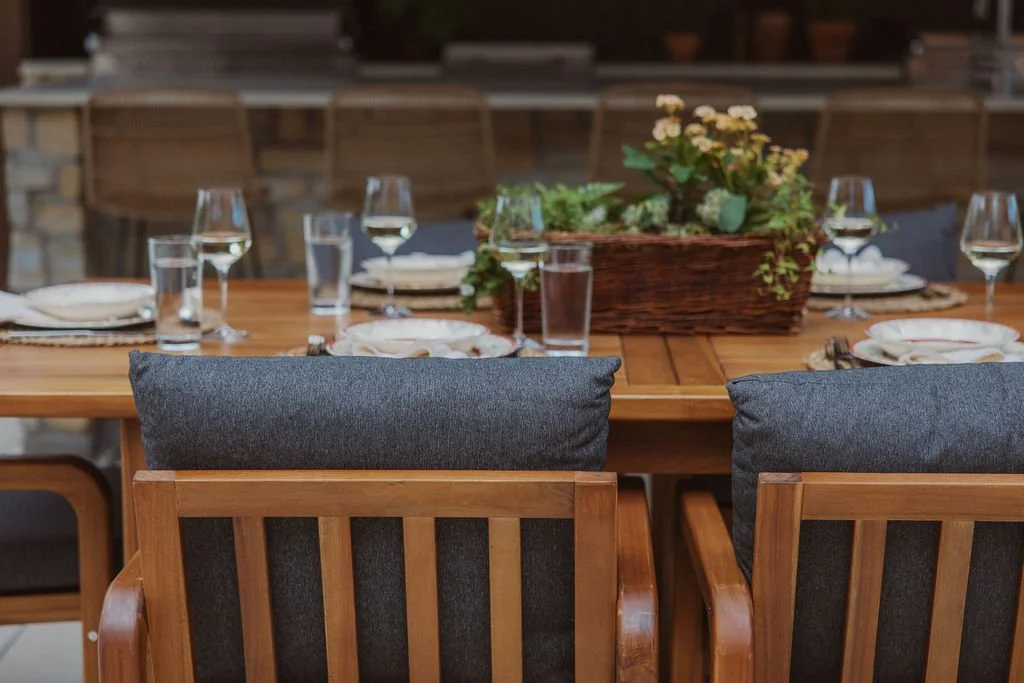 The outdoor furniture is built for real use. Each piece has a protective cover - at the end of the day you throw them on and go inside. No hauling cushions, no worrying about overnight rain.