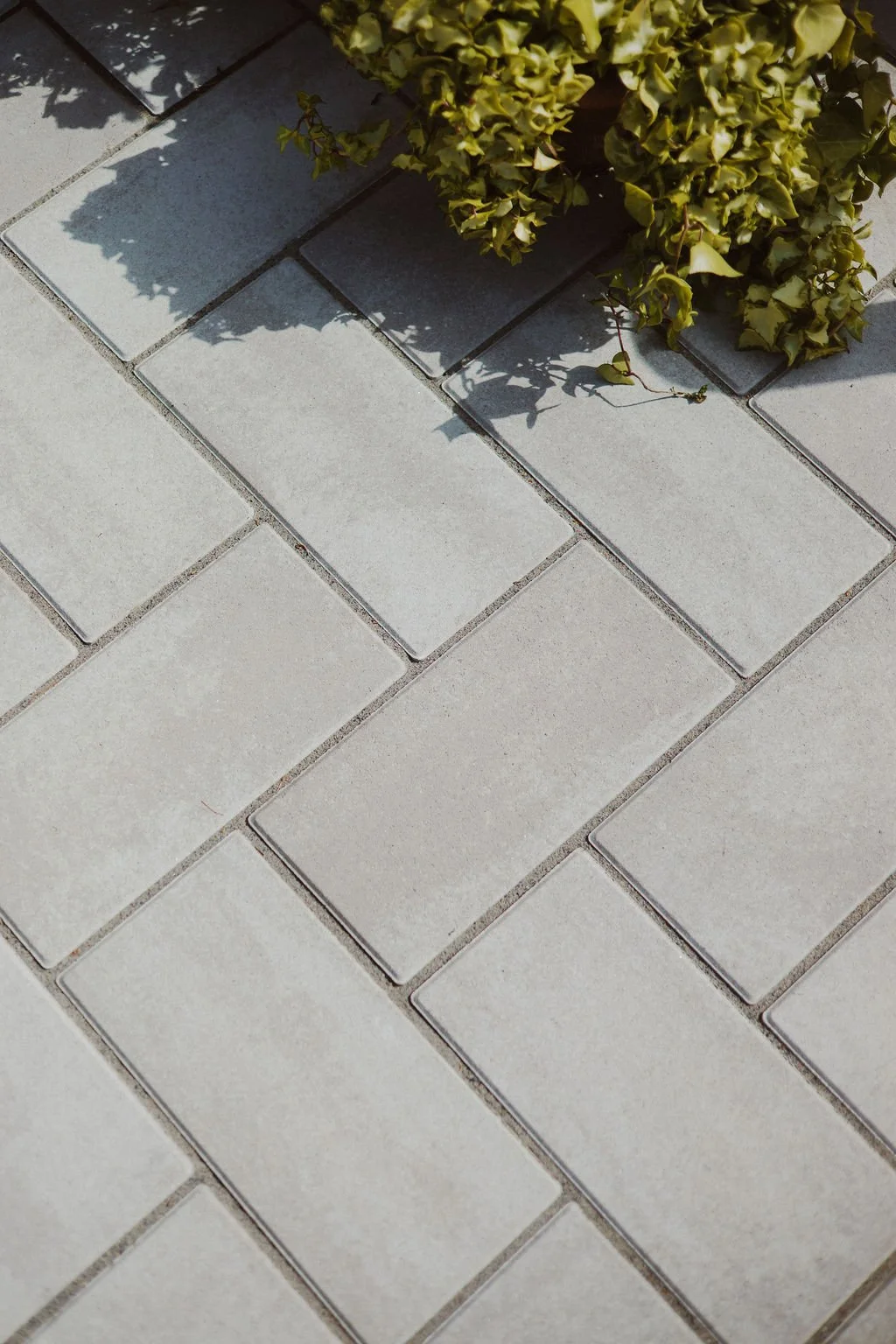 The patio is laid in a herringbone pattern - a detail that gives the space its own character underfoot without competing with everything around it.